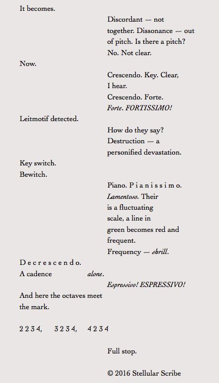 “Ah, but music is the highest of all visual arts,” Baseem said, his eyes smiling. “You know better than anyone, Ludovica, that music remembers. Music is memory. And what is memory if not visual?” He crossed the deck towards me, taking heavy, deliberate steps with the heels of his boots. “There is an aching in your compositions. A red. A remembrance. You must hear it.”
